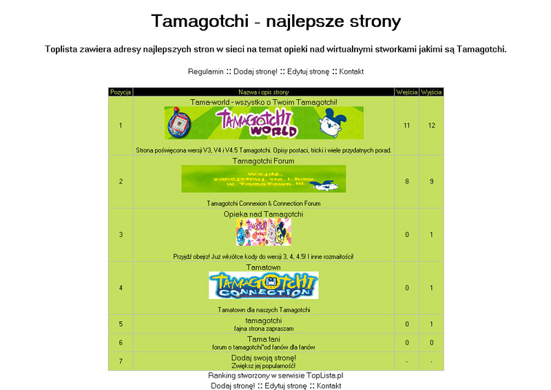 Toplista zawierająca adresy najlepszych stron w sieci na temat opieki nad Tamagotchi. Jeśli jesteś autorem podobnej strony, możesz dodać tam jej adres, a na pewno przyczyni się to do wzrostu jej popularności.