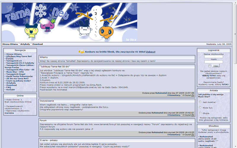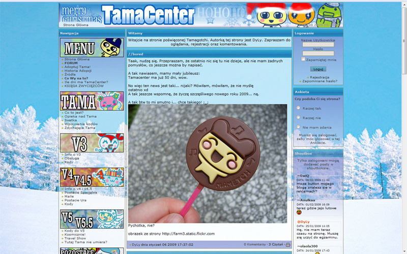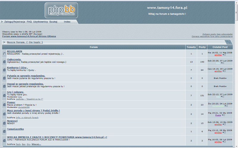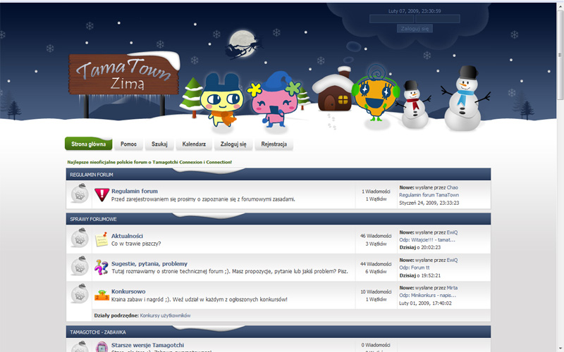 Niewielkie, ale zadbane forum o Tamagotchi. Układ kategorii podobny do forum Tama-world. Niepotrzebny jest moim zdaniem wielki obrazek powitalny, bo tylko przeszkadza w korzystaniu z forum. Nowych użytkowników przyciągnąłby też pewnie ładniejszy nagłówek.