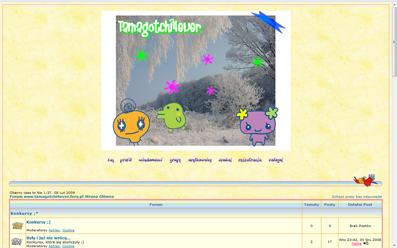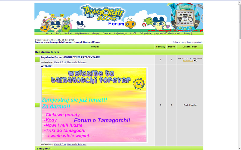 Wytrwale prowadzone forum o Tamagotchi, zawiera już ponad 1000 postów. Zmieniłabym nagłówek na mniejszy i dodałabym coś, co wyróżniałoby je spośród wielu innych for na fora.pl