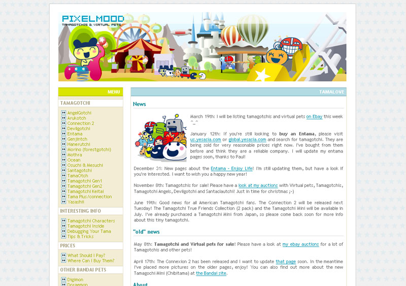 Niedawno założona strona na temat Tamagotchi. Posiada własne forum dyskusyjne, obecnie jednak wyłączone. Zawiera kilkanaście artykułów, większość jest jednak zbyt krótka i mało treściwa. Na stronie brakuje obrazków, niezły nagłówek to prawie jedyna jej część graficzna.